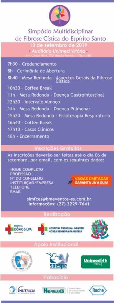 Simpósio Multidisciplinar de Fibrose Cística do Espírito Santo Autor do post:admin Post publicado:2 de setembro de 2019 Categoria do post:Notícia